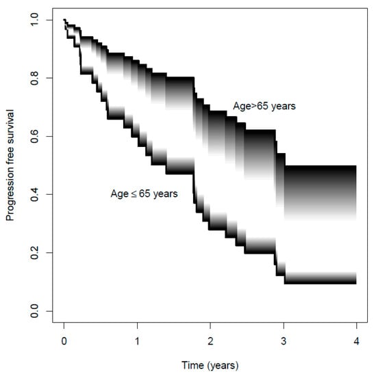 Survival functions predicted by the Cox model. From gray to black, AUCcum90 increases from the lower bound of the IQR (880 ng·h·mL−1) to its upper bound (1412 ng·h·mL−1). The bottom and top curves represent the survival functions in the younger (age ≤ 65 years, n = 25) and older (age > 65 years, n = 19) patients, respectively.