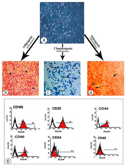 Characterization of bone marrow-derived mesenchymal stem cells: (a) the adherent cells appeared fusiform in shape with an elliptical nucleus (arrow); (b) BM-MSCs differentiated into adipocytes and stained with Oil Red O exhibited intense cytoplasmic staining, signifying the accumulation of lipid vacuoles (head arrow); (c) BM-MSCs differentiated into chondrocytes, exhibiting positive Alcian Blue staining (wavy arrow); (d) BM-MSCs differentiated into osteocytes and stained with Alizarin red staining, indicating clusters of calcium depositions (thick arrow); (e) FACS analysis of isolated stem cells showing that the bone marrow-derived mesenchymal stem cells were strongly positive for CD105, CD29, CD44, and CD90 markers but negative for CD34 and CD45 markers.