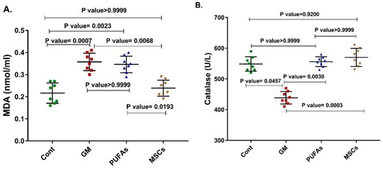 Cardiac MDA content was significantly enhanced in the gentamicin-induced cardiac degeneration model (p = 0.0007). Treatment with MSCs reduced MDA expression significantly (p = 0.0068). An insignificant change in MDA expression was observed in the PUFA-treated group (p > 0.9999) (Figure 2). Cardiac catalase activity was significantly reduced in the gentamicin-induced cardiac toxicity degeneration model (p = 0.0457). Treatment with either MSCs or PUFAs significantly enhanced catalase activity (p = 0.0003; p = 0.003, respectively) (Figure 2).