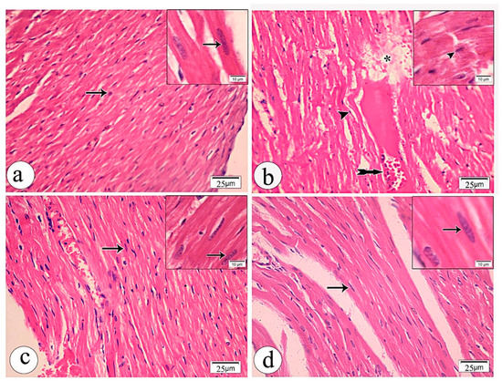 Photomicrographs of heart sections stained by hematoxylin and eosin: (a) control group showing the normal histological structure of cardiac myocytes that appeared arranged in a linear array that branched and anastomosed with acidophilic sarcoplasm and oval, centrally located nuclei (arrow); (b) gentamycin-treated group showing that most of the cardiac muscle fibers were disorganized and lost the normal striations, while nuclei of the cardiomyocytes showed deformation in sizes and shapes, and others appeared pyknotic (Head arrow), in addition to cytoplasmic loss and fragmentation of cardiac muscle (star) and interstitial hemorrhage (tailed arrow); (c) gentamycin- and PUFA-treated group showing regular arrangement of the cardiac muscle fibers with oval, centrally located vesicular nucleus (arrow); (d) gentamycin- and MSC-treated group showing regularly arranged cardiac myofibers with oval, rounded nuclei (arrow). Note that inset images of higher magnification were added in all panels photos to show the nucleus.