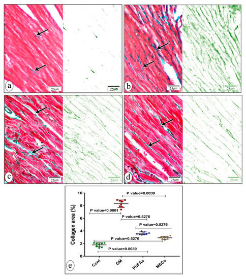 Photomicrographs of sections of heart stained by Masson trichrome: (a) control group showing scanty collagen fibers in green color in between the cardiomyocytes which appear dark red in color (arrow); (b) gentamycin-treated group showing increased collagen fibers between the cardiomyocytes (arrow); (c) gentamycin- and PUFA-treated group showing less serious accumulation than gentamycin group(arrow); (d) gentamycin- and MSC-treated group showing reduced collagen accumulation (arrow). (e) Statistical analysis of collagen score. Nonparametric statistics were used. Data were analyzed using the Kruskal–Wallis test followed by Dunn’s test. Results are expressed as medians and interquartile ranges. Differences were considered significant at p < 0.05.