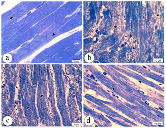 Semithin sections of cardiac muscles showing transverse striations: (a) Control group showing cylindrical cardiac muscle fibers and central, oval, and vesicular nuclei, along with visible transverse striations (head arrow); (b) gentamycin-treated group showing loss of striation in some parts of the cardiomyocytes( head arrow), along with areas of fibrinolysis (star); (c) gentamycin- and PUFA-treated group showing restored normal striation of cardiac muscle fibers but less prominent striations compared with the control group (head arrow); (d) gentamycin- and MSC-treated group showing more or less normal cardiac muscle fibers with visible transverse striations (head arrow).