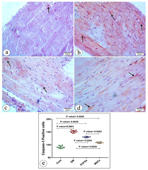 To investigate whether PUFA and MSC treatment influences gentamicin-induced apoptosis, we determined caspase-3 expression, a cardiac apoptotic parameter, using immunohistochemistry. In controls, cardiac caspase-3 expression was minimal (Figure 6a). In contrast, injection of gentamicin increased cardiac caspase-3 expression markedly (Figure 6b). However, PUFA treatment promoted lower caspase-3 expression in the cardiac myocytes (Figure 6c) compared to animals treated with gentamicin alone. Moreover, MSC treatment decreased caspase-3 expression in the cardiac myocytes (Figure 6d). After quantifying the intensity of caspase-3 expression via immunohistochemistry, we found that rats treated with gentamicin had a significantly greater increase in caspase-3 expression compared to control animals (p < 0.0001). However, MSC treatment promoted significantly lower caspase-3 expression compared to gentamicin-treated animals (p = 0.0039), while PUFAs resulted in an insignificant reduction (p = 0.528) (Figure 6e).