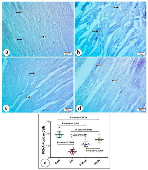 To examine whether gentamicin affects cellular proliferation and whether PUFA and MSC treatment impacts cell proliferation, we evaluated the expression of PCNA, a cellular proliferation marker in cardiac tissue, using immunohistochemistry. Accordingly, control rats showed moderate PCNA expression in the cardiac myocytes (Figure 7a). In contrast, gentamicin injection markedly decreased PCNA expression in cardiac myocytes (Figure 7b). However, PUFA treatment promoted significantly greater PCNA expression in cardiac myocytes (Figure 7c) compared to gentamicin alone. Similarly, MSC treatment significantly increased PCNA expression in cardiac myocytes (Figure 7d). Quantitative analysis of PCNA expression via immunohistochemistry showed a significant decrease in PCNA expression among rats treated with gentamicin compared to control animals (p < 0.0001). However, MSC treatment promoted a significantly greater PCNA expression compared to gentamicin treatment (p = 0.004), with an insignificant effect of PUFAs (p = 0.381) (Figure 7e).