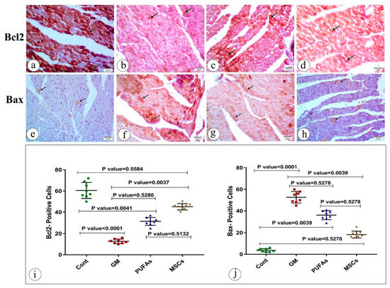 Immunostained sections of heart tissue of Bcl2 and Bax expression in cardiac myocytes in all studied groups. Positive staining is shown by a brown or red color: (a) control group showing strong Bcl2 immunohistochemical staining of control heart tissue in most of cardiomyocytes (arrow); (b) gentamycin-treated group showing minor positive Bcl2 immunoreactivity in cardiomyocytes (arrow); (c) gentamycin- and PUFA-treated group showing moderately positive Bcl2 immunoreactivity in some of the cardiomyocytes (arrow); (d) gentamycin- and MSC-treated group showing strong positive Bcl2 immunoreactivity in most cardiomyocytes (arrow); (e) control group showing positive Bax immunohistochemical staining of control heart tissue in a few myocytes (arrow); (f) gentamycin-treated group showing strong positive Bax immunoreactivity (overexpression of Bax) in the cardiomyocytes (arrow); (g) gentamycin- and PUFA-treated group showing moderately positive Bax immunoreactivity in some of the cardiomyocytes (arrow); (h) gentamycin- and MSC-treated group showing slight dark-red positive Bax immunoreactivity in most myocytes almost similar to the control (arrow). (i,j) respectively showing Statistical analysis of Bcl2 and Bax expression in cardiac myocytes in all groups studied. Nonparametric statistics were used. Data were analyzed using the Kruskal–Wallis test followed by Dunn’s test. Results are expressed as medians and interquartile ranges. Differences were considered significant at p < 0.05.