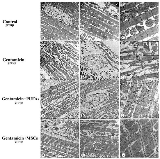 Control rat cardiac myocytes contained oval and centrally placed nuclei with finely scattered chromatin, which were surrounded by an intact nuclear membrane, according to electron microscopy (Figure 9a). The sarcolemma limiting cardiac myocytes displayed invaginations at the Z-lines to generate transverse tubules (T tubules) (Figure 9b). Mitochondria were observed between the myofibrils and had a spherical or elongated shape, were abundant, and were arranged regularly in rows between the myofibrils. The myofibrils were grouped in sarcomeres between Z lines, with a dark A band in the center and a light I band on the edges. A light H zone could also be observed in the dark A band center (Figure 9a–c). In gentamicin-treated rats, with lysis of the myofibrils and enlarged interfibrillar gaps, cardiac myocytes were fragmented and disorganized (Figure 9a). In the nuclei, chromatin condensation in the nucleoplasm was detected as an atypical chromatin pattern (Figure 9b). These changes caused disorganization and disarrangement of Z lines and H lines. The mitochondria had disrupted cristae (Figure 9c). In the gentamicin- and PUFA-treated group, myofibrils exhibited better reconstruction and reorganization compared to those in group II, although some loss was still observed (Figure 9a). The chromatin pattern of vesicular nuclei was observed to be normal (Figure 9b). Although rearrangement and continuation of Z lines and H lines were observed, some areas had a discontinued Z line. Regular cell membranes and their invagination could be seen at the site of the T tubules. Mitochondria in group III were better organized in between myofibrils compared to those in group II (Figure 9c). The ultrastructural sections of the gentamicin- and MSC-treated group showed reconstruction and reorganization of myofibrils, with vesicular nuclei showing normal chromatin patterns and regular cell membranes (Figure 9a,b). We observed Z- and H-line rearrangement and continuation, as well as invagination at the T tubule site. Mitochondria in group III were better organized between myofibrils compared to those in group II (Figure 9c).