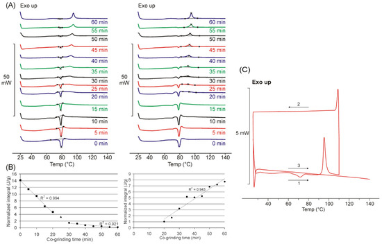 A complex heating procedure was used to interpret the new exotherm peak that appeared. The product co-ground for 60 min was first heated to 110 °C, cooled, and reheated to 140 °C. No thermoanalytical signal was observed during cooling and the second heating, confirming that the product formed during the first heating has adequate stability, in which no internal phase transformation takes place during the second heating (Figure 1C).