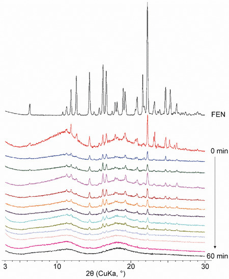 Diffractograms of FEN and co-ground products measured in every 5 min from 0 min to 60 min product. With the increasing grinding time, characteristic peaks decreased, and an amorphous product has been observed.