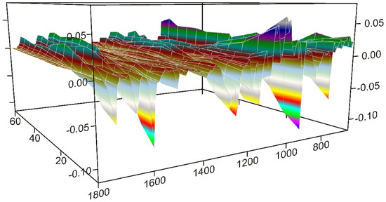 The corresponding synchronous surface showed a strong correlation at 1728 cm−1, from which these wavenumbers differed within the range of optical resolution, 4 cm−1, of the spectra, so the bands causing it strongly overlapped and prevented the successful application of other, more conventional methods. At the same time, these changes were superimposed on the synchronous change of the peak intensity at 1728 cm−1, so they have random-like behavior due to the heterogeneous state of the samples. Against this, the position of these peaks suggests that the environment of the ester group of some FEN molecules changed in a way that the C=O stretching band shifted to lower energies, indicating stronger interaction with its environment than that which was within the crystal frame, while this environment changed later, causing a shift of the same band to higher energy values, causing the asynchronous widening of the band.