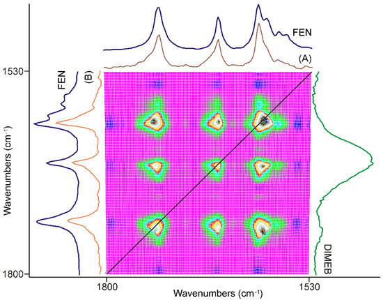 The number of diagonal peaks increased to five from three. The axial sections taken at the corresponding peak positions, e.g., at 1740 cm−1 (A) and 1726 cm−1 (B) in Figure 7, also showed that the C=O stretching peaks were shifted from the peak positions of FEN, either to higher or to lower wavenumbers.