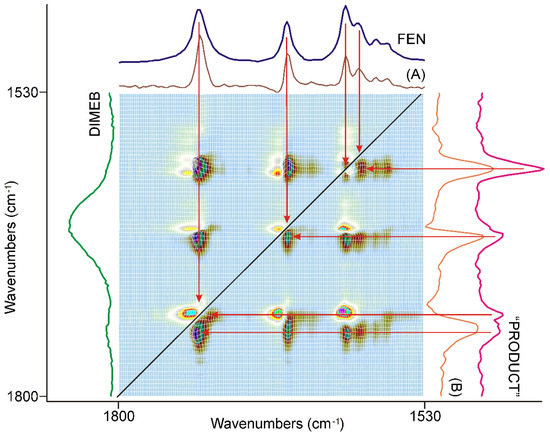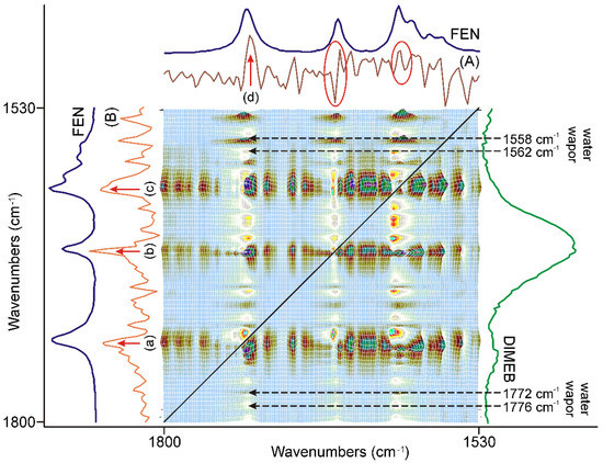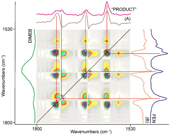 The asynchronous correlation surface gained from the spectra, recorded during the second 20 min long period of time, was clearer than that of the first 20 min. No strong contribution from water vapor or spectral noise was seen in the range of 1800–1530 cm−1, as shown in Figure 8. The wavenumbers gained from the position of the off-diagonal peaks were practically the same as those of the diagonal peaks on the synchronous surface. The x- and y-axial sections taken in the C=O stretching region of the ester group, (A) at 1740 cm−1 and (B) at 1728 cm−1, confirmed that the opposite sign depended on the “origin” of the peak, and they were opposite if they came from FEN or “PRODUCT” (Figure 8).
