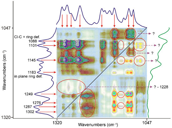 Extending the study of the asynchronous correlation surface, the most significant features showed up in the range from 1320 cm−1 to 1047 cm−1, shown in Figure 6.