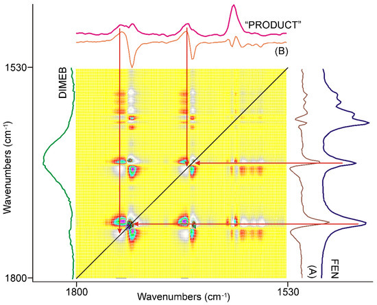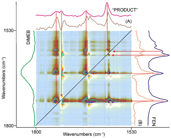 The synchronous correlation surface calculated from the spectra recorded during the last 20 min long period of time, between 1800 and 1530 cm−1, showed a very similar picture to that of the previous 20 min. The axial sections were taken at 1742 cm−1 (A) and 1728 cm−1 (B), confirming that the consumption of the residue of FEN was the dominating process accompanied by lesser contribution from the formation of “PRODUCT”. The range of the aromatic ring stretching modes around 1600 cm−1 showed very low intensities.