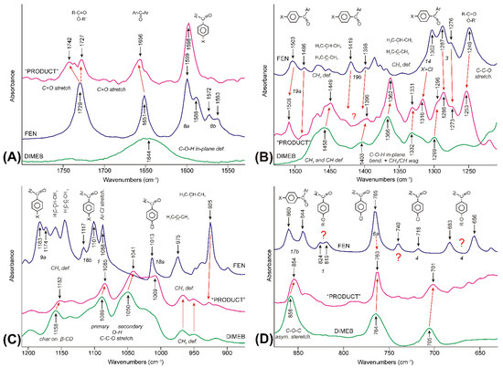 Comparison of IR-ATR spectra of FEN (purple line), DIMEB (green line), and “PRODUCT” (magenta line), in the 1800–630 cm−1 spectral range, which was divided into four parts (A–D). Red arrows show interpretation of the peaks of the raw materials shifted and widened. The vibrations that were impossible to identify, marked with question marks.