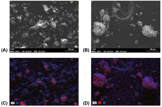 SEM images of samples taken prior to grinding (A) and after 20 min of grinding (B) showed less only DIMEB containing separated particles after grinding. The corresponding EDS mapping images (C,D) showed more evenly distributed FEN in the aggregates, with a higher ratio on the surface, after 20 min of grinding.