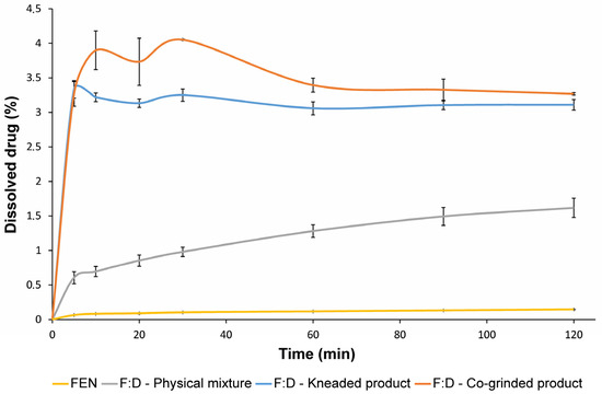 Dissolution studies were carried out using modified pharmacopeia methods in simulated intestinal fluid. The dissolution curves of the pure drug and its products with an equimolar ratio are shown in Figure 13 and corresponding calculated DE values in Table 1. FEN alone is practically insoluble in this aqueous solution. All binary systems showed better dissolution properties than the drug alone. Since there is a small concentration of dissolved cyclodextrin in the medium, the physical mixture shows increased solubility compared to the API alone, but this enhancement is limited. However, with the kneaded and co-ground products, a much greater increase in solubility was achieved. The co-ground product exhibits a faster dissolution rate and a slightly better solubility than the kneaded product. This is probably because the co-ground product is completely amorphous, while the kneaded product remained slightly crystalline.