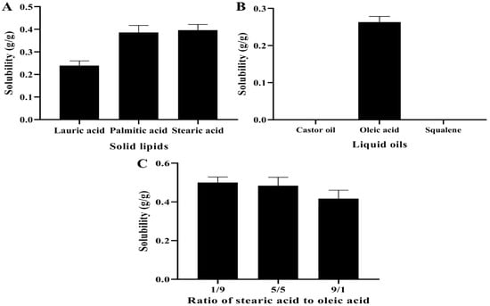 Screening of the solid and liquid lipids for the solubility of MAD. (A) Solubility of MAD was determined in different solid lipids. (B) Solubility of MAD was analyzed in various liquid lipids. (C) Solubility of MAD was detected in varied ratios of stearic acid and oleic acid.
