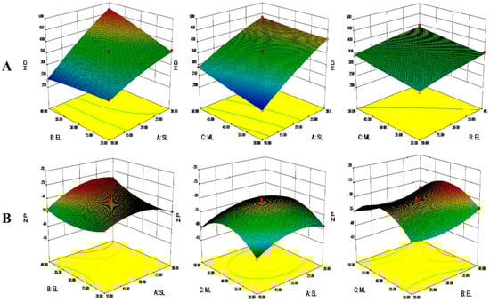 Three-dimensional response surface images of the solid lipid to lipid ratio (SL), emulsifier to lipid ratio (EL), and MAD to lipid ratio (ML) on (A) the hydrodynamic diameter (HD) and (B) zeta potential (ZP).