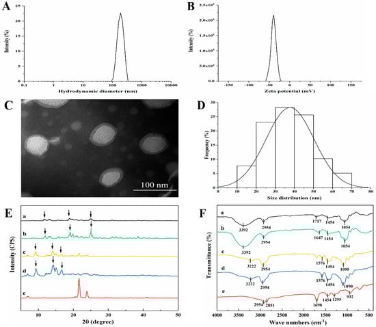 Characterization of the optimized MAD–NLCs. (A) Hydrodynamic diameter (HD) and (B) zeta potential (ZP) of the MAD–NLCs were determined by DLS. (C) The morphology of the MAD–NLCs was observed by TEM, and (D) the size distribution was obtained via analysis of the particles from several TEM images. (E) XRD patterns and (F) FTIR spectra for (a) MAD–NLCs, (b) blank NLCs, (c) the physical mixture, (d) MAD, and (e) SA were shown.