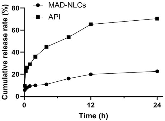 The in vitro release curves of the MAD–NLCs are shown in Figure 4. The cumulative release rate of the MAD–NLCs from 0 to 12 h was only 19.93 ± 3.58%, while that of the API was 65.26 ± 0.28%, demonstrating the slow-release characteristic of the MAD–NLCs. The cumulative release rate of the MAD–NLCs in PBS for 24 h (22.64 ± 1.65%) was significantly lower than that of the API (70.47 ± 0.89%). The MAD–NLCs exhibited a slow-release behavior in PBS, which may be attributed to the almost complete encapsulation of the MAD in the NLCs.