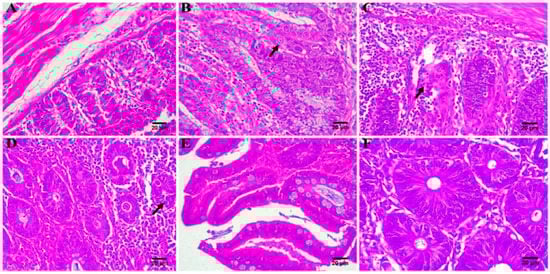The ceca of the chickens in each group were taken for HE staining after the experiment, and the results are shown in Figure 5. The cecum tissue of the chickens in the uninfected–untreated group appeared normal (Figure 5A). In the infected–untreated group (Figure 5B), the cecal tissues were seriously damaged due to coccidia parasitism, and the intestinal cavity contained a large number of exfoliated epithelial cells and coccidia oocysts; obviously, the pathological change of the cecum was caused by coccidia parasitism []. The lesions of the ceca of the treatment groups (Figure 4C–F) were relatively mild, and the cecal structure was basically normal, with a few inflammatory cell infiltrations and a small number of oocysts. These results indicated that the MAD–NLCs were therapeutically effective against cecal lesions caused by avian coccidiosis.