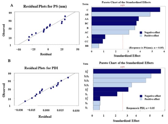 Furthermore, the observed values of R2 were comparable to the predicted values of R2, as displayed in Figure 1A,B, meaning that the models almost entirely fitted the explanation of the experimental scale investigated. Pareto charts of standardized effects for PS and PDI with independent variables and their relationships are presented in Figure 1A,B. Table 2 shows that the actual droplet sizes of PC-NEs ranged from 9.93 ± 0.33 to 411.90 ± 15.1 nm, while the predicted values ranged from 381.62 to 4.82 nm. The PDI of the prepared PC-NEs was between 0.005 ± 0.0002 and 0.186 ± 0.02, while the predicted value was between 0.027 and 0.18, indicating that the produced NEs were highly dispersed. Values of PDI less than 0.3 are considered indicative of narrow size distribution [].