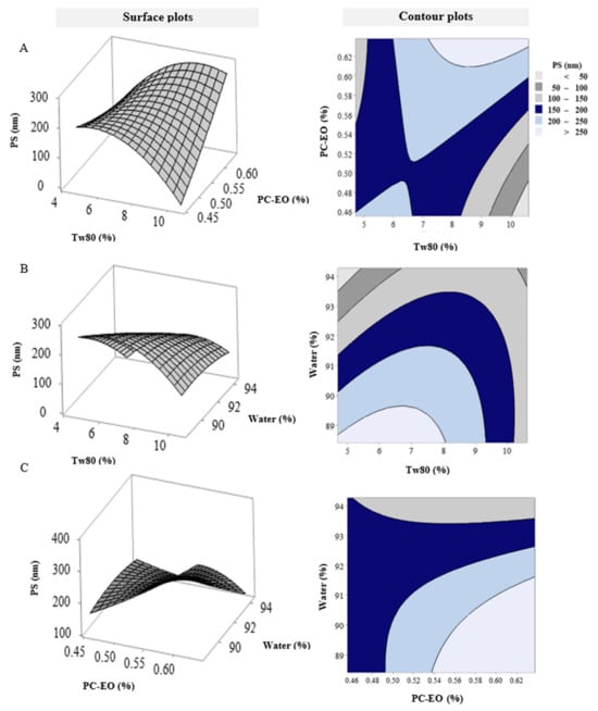 The 3D response surface and contour plots exhibiting combined effects of (A) PS versus Tw80 (%) and PC-EO (%), hold value: water (%) 91.34; (B) PS versus Tw80 (%) and water (%), hold value: PC-EO (%) 0.55; (C) PS versus water (%) and PC-EO (%), hold value: Tw80 (%) 7.66.