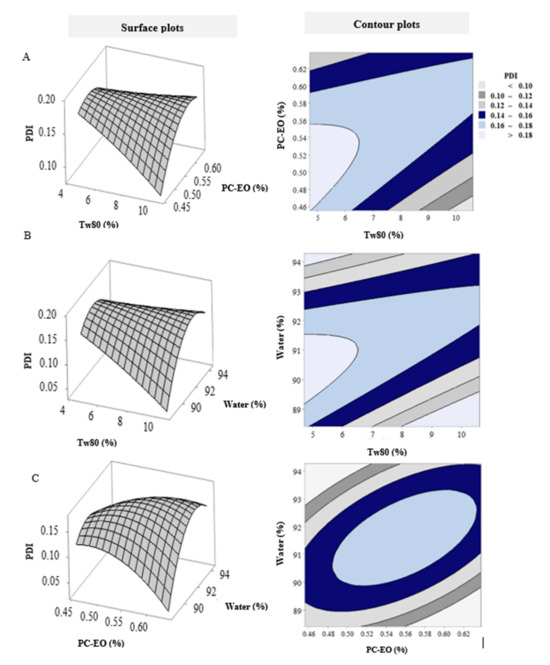 The 3D response surface and contour plots exhibiting combined effects of (A) PDI versus Tw80 (%) and PC-EO (%), hold value: water (%) 91.34; (B) PDI versus Tw80 (%) and water (%), hold value: PC-EO (%) 0.55; (C) PDI versus water (%) and PC-EO (%), hold value: Tw80 (%) 7.66.