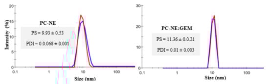 The average of droplet size of the PC-NE loaded with GEM (PC-NE:GEM) was 11.36 ± 0.0.21 nm, with a PDI of 0.010 ± 0.003 (Figure 4). The droplet size was increased because of the GEM loading [,]. A lower PDI value indicates more uniform droplet size [].