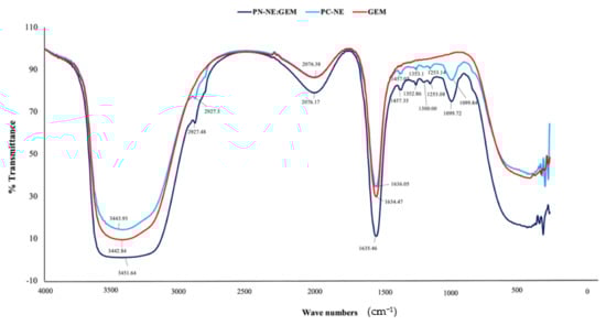 Fourier transform infrared spectroscopy (FTIR) was used to evaluate the interactions between PC-NE and GEM in PC-NE:GEM formulation. All FTIR spectra were analyzed in the range 380–4000 cm−1. Variations in the structures of GEM, PC-NE, and PC-NE:GEM are depicted in Figure 5. The most prevalent peaks in GEM, PC-NE, and PC-NE:GEM were observed at 3343, 2076, and 1635 cm−1. The 3343 cm−1 spectra showed strong and very broad peaks which were attributed to vibration. The stretching of O-H group was strong and very broad at 3343 cm−1 [,], while C=O stretching was strong and narrowed at 1635 cm−1 [,]. However, the peak intensities at 3343, 2076, and 1635 cm−1 were increased more in PC-NE:GEM than in GEM and PC-NE. Therefore, these increases proved that GEM was successfully loaded onto PC-NE. The other peaks common in PC-NE and PC-NE:GEM observed at 2929, 1460–1353, 1300–1253, and 1099 cm−1 were weak, and may include spectral attributes from CH2 asymmetric stretching [,] and stretching vibrations from C-H [,,], C-O [,,], and C-O-C [,,].