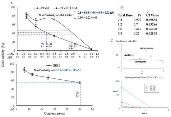 Consequently, the combination of GEM and PC-NE (1:1 ratio) produced a synergistic effect, and all the plotted points (blue circles) are below the black line. Moreover, the isobologram revealed that the combination of GEM and PC-NE (1:1 ratio) produced 90% (green line), 75% (red line), and 50% (blue line) inhibitions. As shown in Figure 6C and Figure 7C, all the combination points within their zone are lower than the additive-effect line on the isobologram in both cell lines, revealing the synergistic effect of PC-NE:GEM.