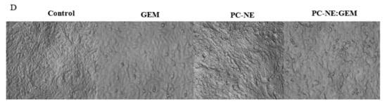 To evaluate the extent of changes in morphology after the MCF-7 and Hep-G2 cells were treated with GEM, PC-NE, and PC-NE:GEM, the MCF-7 and Hep-G2 cells were seeded in a 96-well plate at a density of 104 cells/well for 24 h. Then, after incubation and cell attachment, the cells were treated with 2 doses of each formulation, i.e., GEM (0.3 and 0.5 μM), PC-NE:GEM (0.3% (v/v) + 0.3 μM and 0.5% (v/v) + 0.5 μM), and PC-NE (0.3 and 0.5% (v/v)), for 24 h. Then, the cells were examined under an inverted microscope (Olympus, Southall, UK) at 200× magnification.