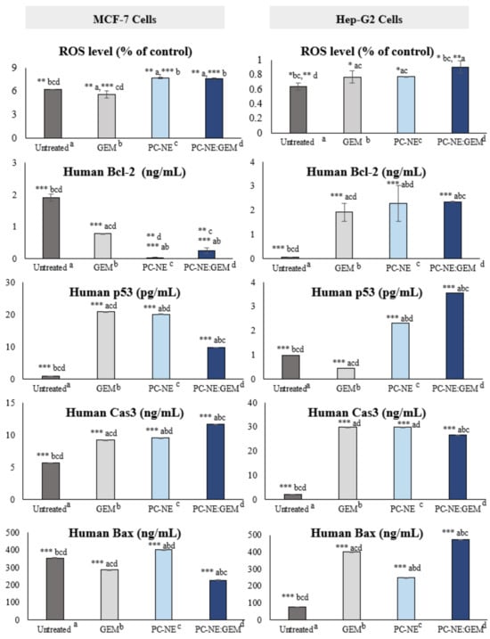 The effects of GEM, PC-NE, and PC-NE:GEM at previously indicated concentrations on the potential of MCF-7 and Hep-G2 cells to promote cancer cell death through induction of intracellular ROS were investigated. High cellular ROS impair the functional integrity of cells by interfering with DNA, proteins, and membrane lipids [], as shown in Figure 9.