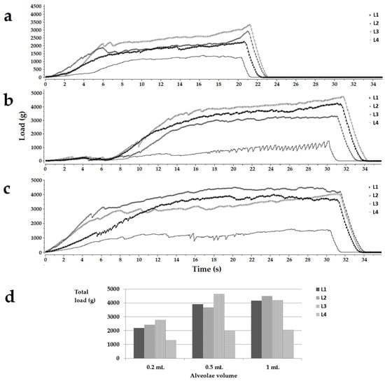 Load (g) vs. time(s) texture analysis representative profiles for the placebo OLs obtained in 0.2 mL (a), 0.5 mL (b), and 1 mL (c) alveolae and a histogram summarizing the total load of the samples (d). Legend: L1, L2, L3, L4, the type of milk.