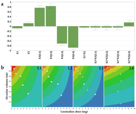 As shown in the histogram of the regression coefficients (Figure 5a), the highest particle sizes were obtained for formulations with high drug loading and associated with the L3 milk. On the contrary, the use of bovine milk L1 led to decreased particle sizes of the reconstituted samples.