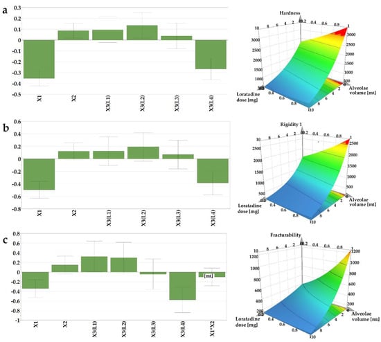 The mechanical attributes of the OLs containing loratadine prepared according to the DoE matrix were determined to evaluate whether the structures containing API provide adequate mechanical resistance to prevent breaking of the structures during transport or handling. The texture profiles as load vs. time were recorded, out of which three parameters were determined: Y2—hardness as the total load at the final displacement; Y3—rigidity at 1 mm depth, and Y4—fracturability as the load that produces the first fracture. Out of the tested factors, the API and the L4 type of milk had a negative influence on the calculated mechanical parameters (Figure 3).