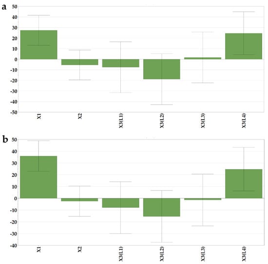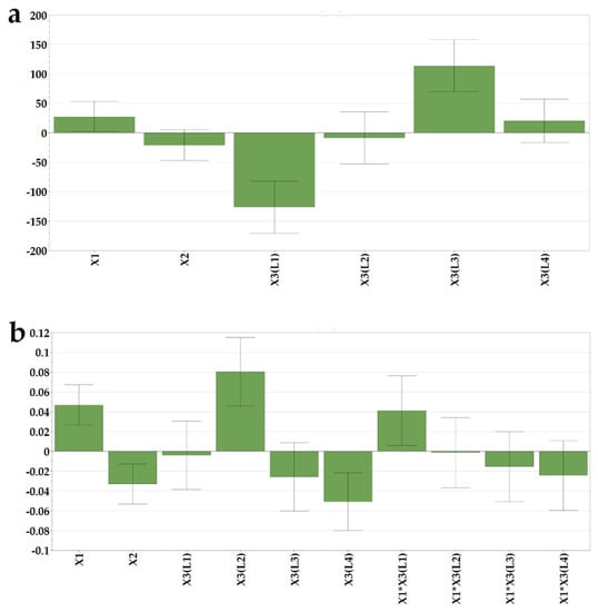 Coefficients of the regression equations displayed as histograms. (a) % of dissolved loratadine after 5 min (Y5) and (b) 10 min (Y6).