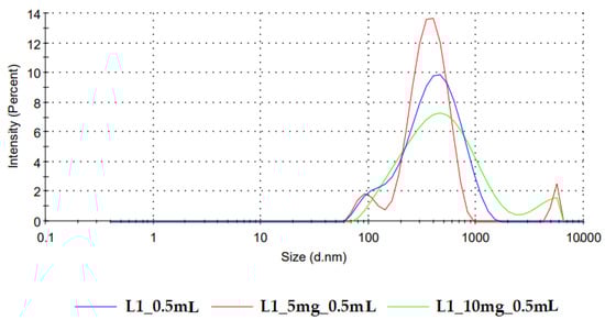 The particle size distribution obtained for the reconstituted placebo formulations coincides with the DLS footprint reported by Kytariolos et al. Figure 6 displays the representative curves of particle size distribution for reconstituted freeze-dried L1 milk prepared in medium-sized alveolae compared to the same product loaded with increasing doses of loratadine of 5 mg and 10 mg, respectively. Bimodal distributions were obtained, with the first peak between 60 and 150 nm attributed to casein micelles and a second one between 200 and 800 nm corresponding to the fat globules [].