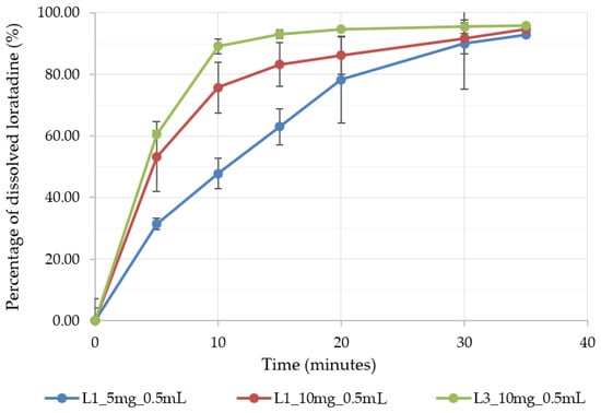 According to the biopharmaceutical classification system, loratadine is a class II drug with low solubility and high permeability. The bioavailability depends on its luminal dissolution, the limiting step of intestinal absorption. Loratadine is also known as an API with pH-dependent solubility. Its weak base character determines the higher solubility of the ionized form in acidic media when compared to its solubility in neutral media []. As the fast dissolution of raw loratadine and commercial immediate-release formulations in acidic media were proved by several authors [], an improved formulation would grant fast and reproducible dissolution at a higher pH. Therefore, the OL formulations were tested for in vitro dissolution at a pH of 6.8. Figure 7 depicts the dissolution profiles of three of the OL formulations prepared in medium-sized alveolae of 0.5 mL, two of them with L1 milk and increasing doses of API, of 5 mg (L1_5 mg_0.5 mL) and 10 mg (L1_10 mg_0.5 mL), and a formulation with L3 milk and a dose of 10 mg of loratadine (L13_10 mg_0.5 mL). As predicted by the DoE models, the increase in the API dose led to significantly higher dissolved API percentages, probably explained by the faster disintegration induced by the lower mechanical strength and by the lower milk content associated with the API dose increase. Out of the three formulations, the best dissolution profile was obtained for L13_10 mg_0.5 mL, with 80% of dissolved API in less than 10 min due to its good wettability and ultra-fast disintegration. The dissolution performance of the three formulations was sustained by their wetting behavior results (Table 6). When exposed to water, the L1 milk compressed samples showed a high contact angle, thus a low wetting capacity, as compared to the L3 milk samples, where the water spread immediately on their surface with a low contact angle and an improved surface free energy.