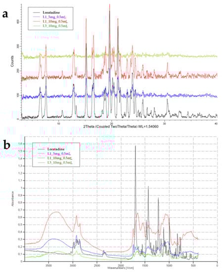 As previous studies showed that loratadine dissolution behavior varied upon crystallinity [], several determinations were made to assess the potential structural changes that may have occurred during OL preparation. Figure 8 displays the XRPD diffractograms and the FT-IR spectra of raw loratadine and selected formulations.