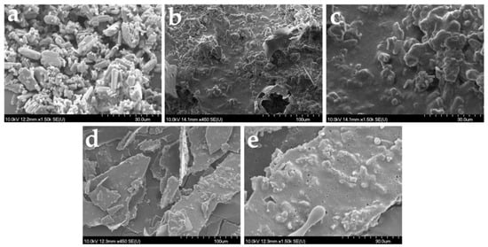 Raw loratadine crystals, presented as polydispersed rod-shaped or oval-shaped crystals, are shown in Figure 9a. The images in Figure 9b–e correspond to the formulations L1_10 mg_0.5 mL and L3_10 mg_0.5 mL, and images captured on the outer surfaces of the freeze-dried products focusing on the loratadine particles and on their appearance were included in the structures. In all images, API particles seem completely included in the pore walls and surrounded by the solid milk matrix. An agglomeration tendency was observed for the formulations with L1 milk, probably caused by its lower viscosity when compared to the one with L3 milk. Moreover, a slight reduction in particle size was visible, partially hindered by the agglomerations. However, this was not sustained by the particle size determinations, which indicates that despite the appearance of solid structures, they will easily and completely redisperse in water. L3 milk formulation displayed thicker pore walls when compared to L1 formulation; visible particles embedded into the pore walls but with lower sizes and better distribution throughout the solid matrix, with a lower agglomeration tendency due to the higher viscosity of the infant formula.