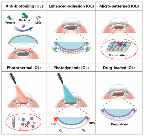 This article mainly places greater focus on the different intraocular lenses prepared by IOL surface modification for PCO prevention, including anti-biofouling IOLs, enhanced-adhesion IOLs, micro-patterned IOLs, photothermal IOLs, photodynamic IOLs, and drug-loading IOLs. We summarize their brief mechanisms for PCO prevention in Figure 2.