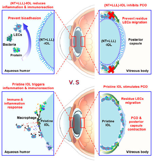 Schematic illustration of the (NT + LLL)-IOL with advantages of anti-bio-adhesion and PCO inhibition, compared to the pristine IOL. Adapted with permission from Ref. [43]. Copyright 2021 Elsevier.