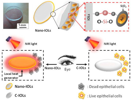 The schematic illustration of nano-IOLs with nanostructured Au@SiO2 outer rim for prevention of posterior capsule opacification. Adapted with permission from Ref. [76]. Copyright 2017 John Wiley and Sons.