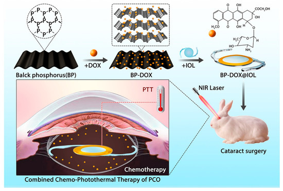 To enhance the efficiency of photothermal IOLs, Mao et al. [85] introduced a combined photothermal therapy and chemotherapy strategy for PCO prevention (Figure 6). BP-DOX@IOL was prepared by assembling the antiproliferative drug doxorubicin (DOX)-loaded black phosphorus (BP) nanosheets onto the non-optical section of the commercial IOL. The NIR light irradiation triggered the release of DOX loaded by BP-DOX@IOL and led to the area-limited heating of the IOL-modified area through the photothermal conversion effect, which jointly destroyed LECs efficiently. Although the BP-DOX@IOL inhibited the progress of PCO to a certain extent after implantation in the eye, the superposition of postoperative near-infrared light treatment achieved a more excellent PCO prevention effect.