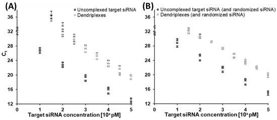 As clearly visible in Figure 4 and specified by coefficients of determination in Table 1, standard curves derived from dilution series as visualized in Figure 3 show a high degree of linearity, indicating good quantifiability over a wide range of target concentrations. Ct values are generally higher with dendriplexes present in the reaction: differences in comparison with samples containing only uncomplexed target siRNA are between six and ten cycles in case of reactions in absence of randomized siRNA (Figure 4A) and between four and seven cycles in case of reactions in the presence of randomized siRNA (Figure 4B). Technical triplicates expressed relatively low degrees of variance, as stated by the error bars (depicting standard deviations of technical triplicate mean values), indicating good intra-assay reproducibility. Highest levels of intra assay variation were seen in samples with low target concentrations as is common for qPCR [51,52]. Inter assay variance was examined by repeating PCR experiments on different days to generate separate biological replicates. Generally, differences between the reactions were more pronounced compared to intra assay measurements, which highlights the need for a separate dilution series as standard for each new experiment.