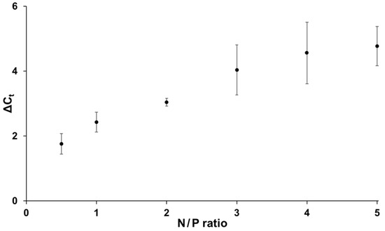The N/P ratio is an important parameter affecting dendriplex properties such as siRNA complexation, accessibility and release profiles [24]. Compositions of dendriplexes with different N/P ratios were run in RT-qPCR experiments to evaluate effects of siRNA complexation on RT-qPCR results. In particular, quantifiability and reproducibility of PCR measurements as well as changing siRNA accessibility in samples with different degrees of complexation were analyzed. Therefore, samples with identical siRNA concentration but different N/P ratios ranging between 0.5 and 5 were prepared as described in the materials and methods section (Equation (1)) and Ct values were compared with equally concentrated uncomplexed target siRNA samples in a RT-qPCR (Figure 5). Ct increased when dendriplexes were present in samples, indicating either a higher degree of siRNA complexation and hence a lower accessibility of the siRNA for reverse transcription which ultimately resulted in decreased target amplification by polymerase, or sterical hindrance of reverse transcriptase and polymerase by the bulky PAMAM. Up to an N/P ratio of 3, increasing the PAMAM and LAH4-L1 concentration resulted in Ct increase. There are tendencies towards plateau formation at even higher Ct levels. Variance between individual measurements was relatively high when measuring samples with N/P ratios higher than 2, suggesting the existence of strong aggregation effects between components in highly concentrated dendriplex dispersions, leading to uncontrollable degrees of siRNA accessibility.