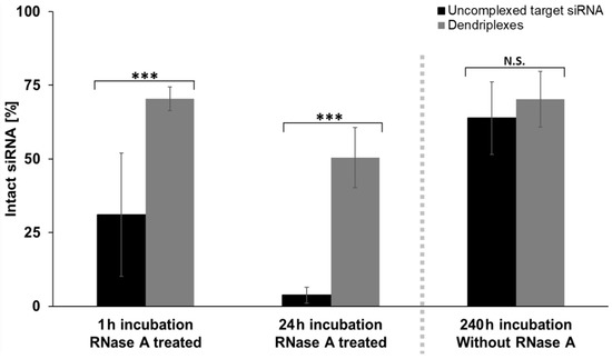 Influence of incubation time and RNase treatment on degradation of uncomplexed target siRNA or siRNA complexed in dendriplexes. Percentages of intact siRNA (in comparison to samples before incubation) after indicated incubation times were calculated as described in Section 2.4. RNase treatment was performed by adding 1 µg/mL (final concentration) bovine RNase A to the sample directly before starting incubation at 37 °C and 500 rpm. Concentration of siRNA at the start of each incubation was 100 nM, resulting in a theoretical concentration maximum of 10 nM in PCR reactions in case of no siRNA degradation. N/P ratio = 5 in all dendriplex samples. Three separate biological samples were prepared and each sample analyzed in PCR triplicate reactions for generation of each data bar. Significant differences between measurements with uncomplexed and complexed siRNA are indicated whenever identified by performing single factor variance analysis (ANOVA). N.S. p > 0.05; *** p ≤ 0.001.