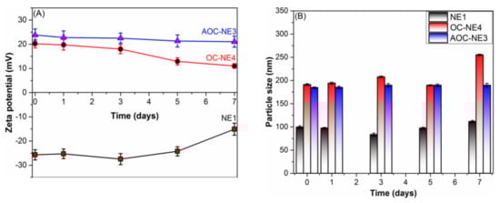 The stability of the new NEs (NE1, OC-NE4, and AOC-NE3) was investigated by monitoring the changes in zeta potential and particle size of the stored NEs for a week at definite time intervals. As shown in Figure 1, in the case of bar primary nanoemulsion (NE1), the zeta potential shifted from −25.69 mV to −15.10 mV, whereas the diameter of emulsion nanoparticles increased from 99.72 nm to 111.67 nm, accompanied by an increase in the PDI (from 0.29 to 0.61). This increase in the nanoparticle size could be attributed to the Ostwald ripening of emulsion droplets [37].
