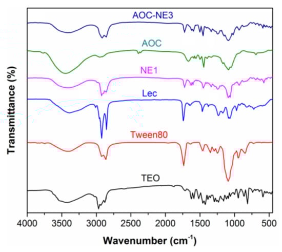 FTIR spectra of the extracted TEO, Tween80, lecithin, primary nanoemulsion (NE1), amphiphilic oligochitosan (AOC), and its secondary nanoemulsion (AOC-NE3).